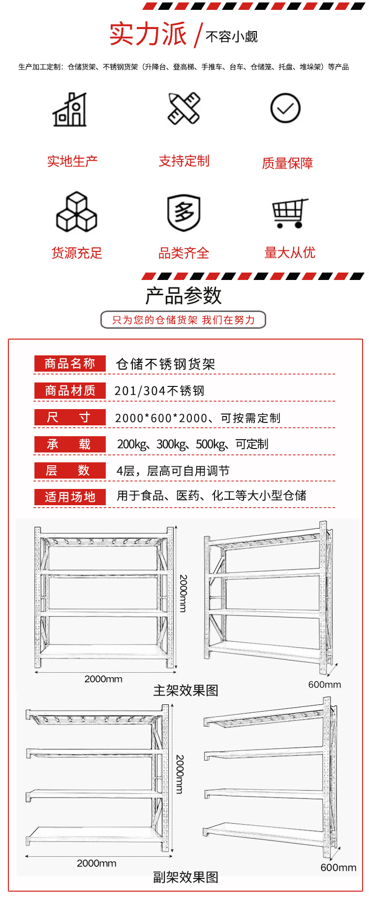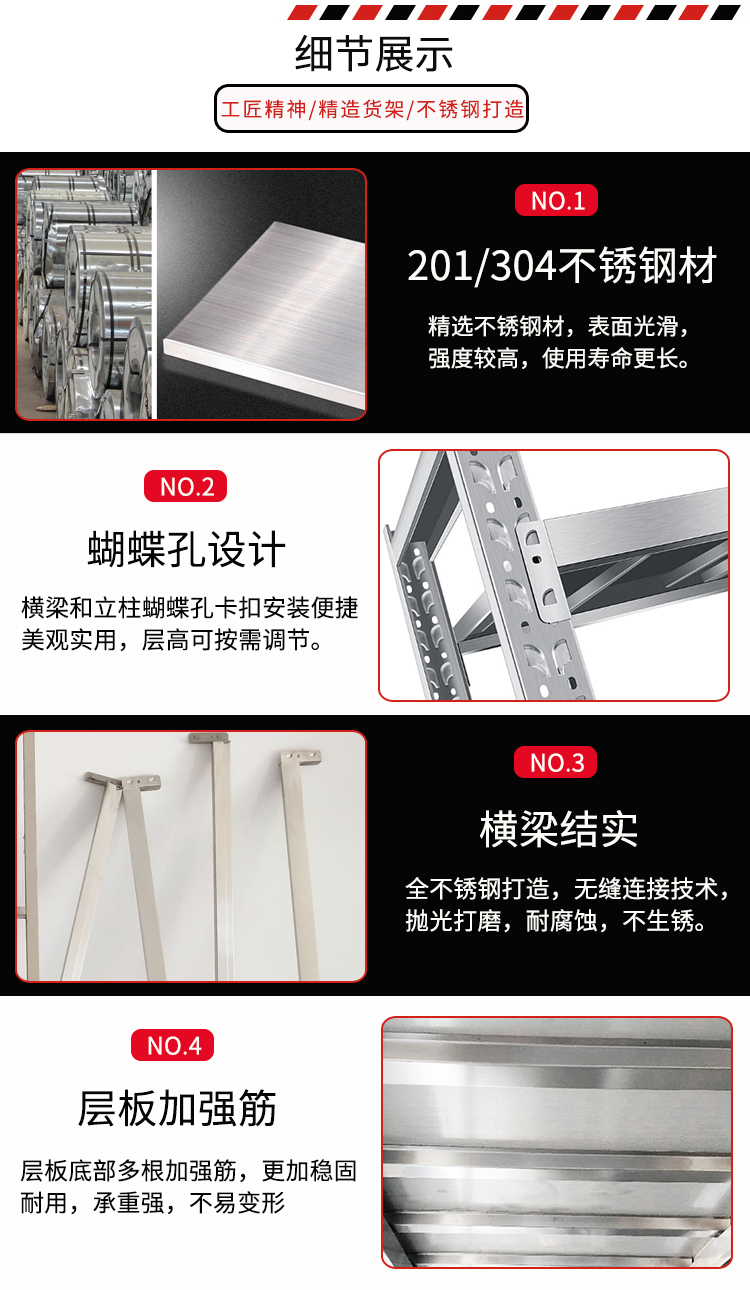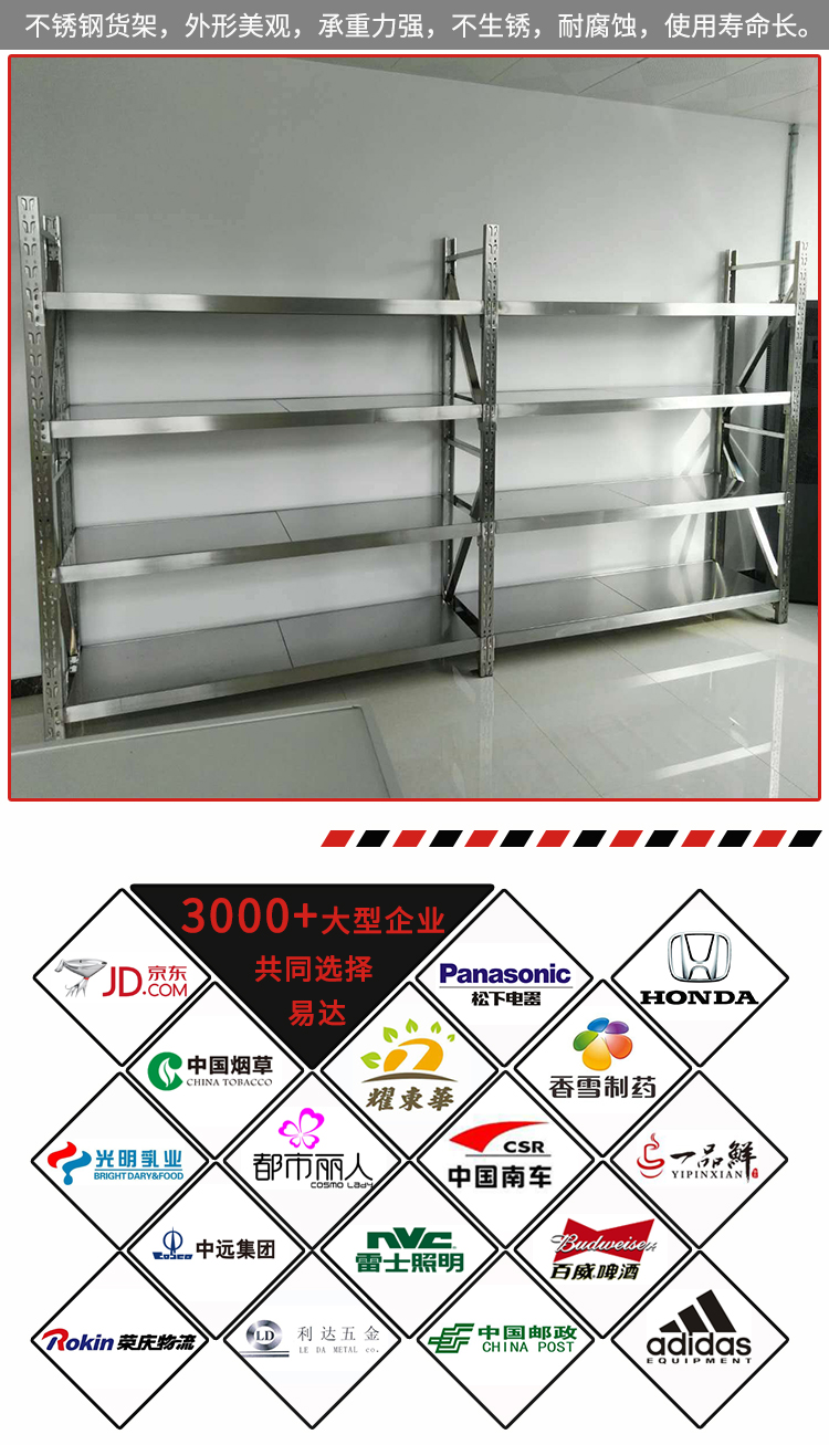 不銹鋼貨架指用于貨物存儲(chǔ)、展示的各種不銹鋼器具。為了適應(yīng)新的形勢(shì)或充分利用空間,便于貨物區(qū)分, 提高空間使用率,可在倉(cāng)庫(kù)、店鋪、居家使用。有現(xiàn)貨、可定制。
